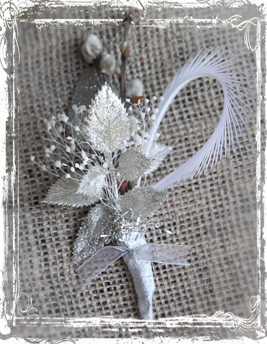 Some custom boutonnieres for Anna. They are a combination of the Winter Wonderland and Fuzzy Pussy Willow boutonnieres. One of the boutonnieres features a splash of red. I really like this combo - well done Anna!
